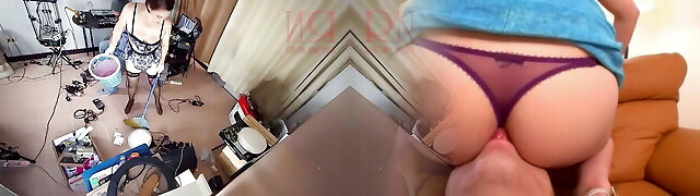 A bare maid is cleaning up in an doofy IT engineer's office. Real camera in office. Gig 1
