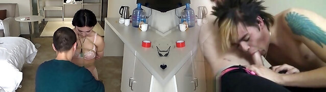 Big Tits Dominant Wifey Sucks Tied Husband & Plays With Phat Mouth Cumshot