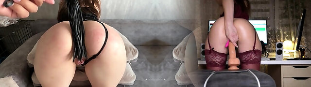 Two kinky fellows is dildo fucking anal hole of bootyful blond girlfriend