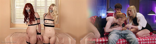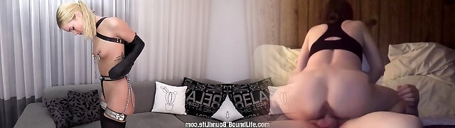 Submissive tied up platinum-blonde and brunette cowgirl get analfucked properly