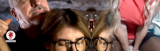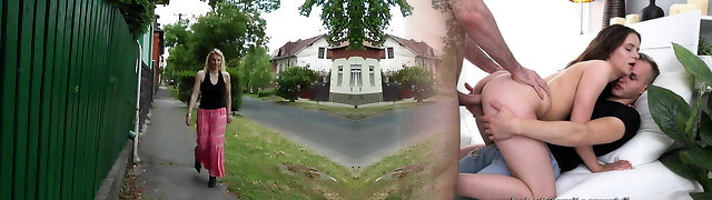 Perverted married couple fucks pretty ash-blonde teen with pigtails