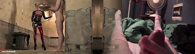 Blonde in Latex Attire Maitresse Madeline Pegging and Spanking a Guy