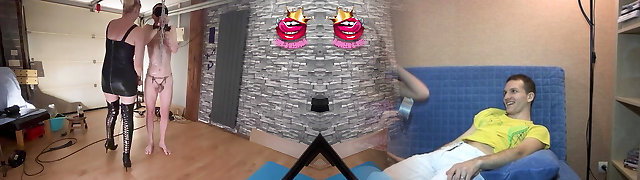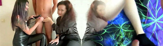 Dominatrix Nika and Mistress Lara play vibrator with slave's dick and plums. Cock And Ball Torture. Games with dick from 2 Mistress.