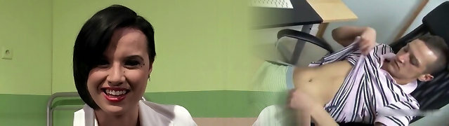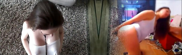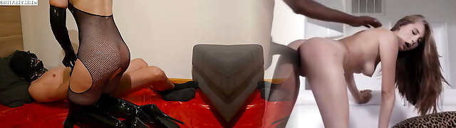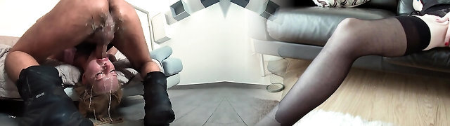 Domme in overknee ballet high-heeled slippers lingerie and latex gloves fucks let slave swallow his cum!