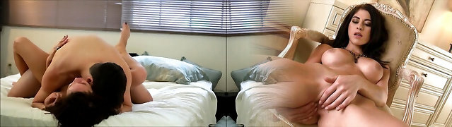 Stunning brunette babe has her juicy cunt pleasured by a super-steamy