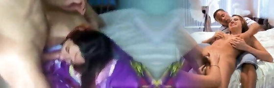 Two kinky dudes poke sweet looking girlfriends in front of tied up girl