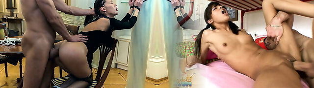 Dudes tie up, punish and fuck and Asian girl at their farm