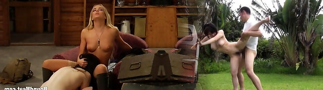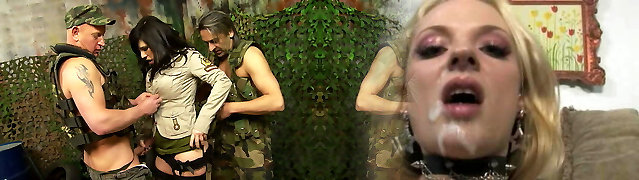 Soldier Girl with Big Hooters and her two cock army