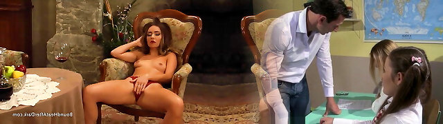Schoolgirl trussed to stocks fingered by teacher while hatch fucked by schoolguys cums to gullet and face in the office feature