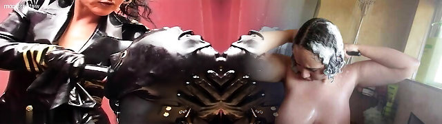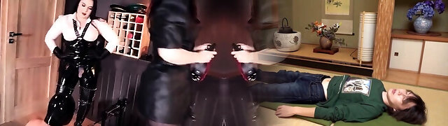 Female Dominance mistress in latex domination playing with slave bondage him to bad