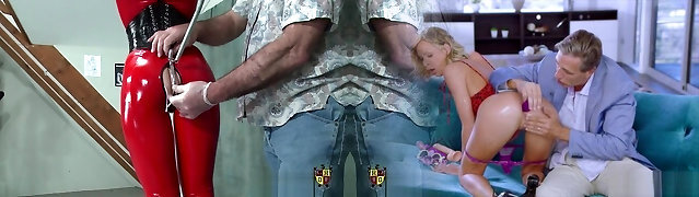 Blonde in Latex Attire Maitresse Madeline Pegging and Spanking a Guy