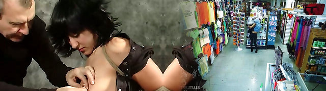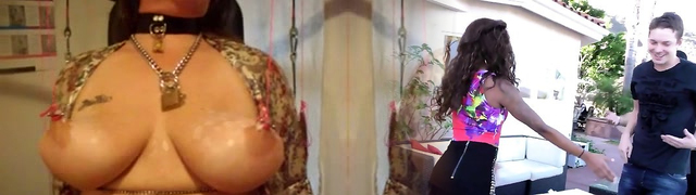 Brunette beauty gets pulled by her pierced nipples in BDSM video