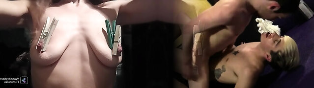 Submissive first-timer wife gets her puffy nipples pinned with metal stuff