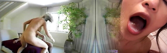 Platinum-blonde gal takes old man up to her house and plays with his nips