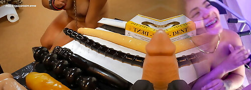 Chastity Humiliation Game: Use your mouth to get your virginity key from condoms on fake penises