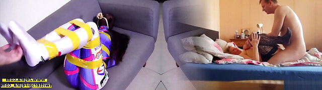 Laura is dressed in a sexy milky dress, pink pantyhose and platform high-heeled shoes, tied up and gagged in a bed