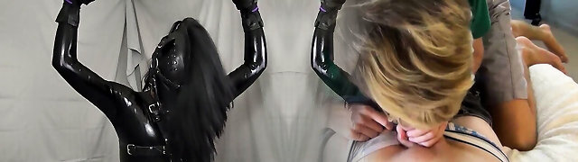 Blonde in Latex Attire Maitresse Madeline Pegging and Spanking a Guy
