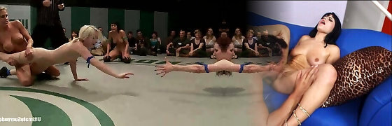 Gang of horny girls fight in a ring and toy pussies