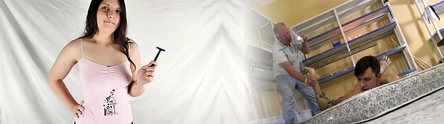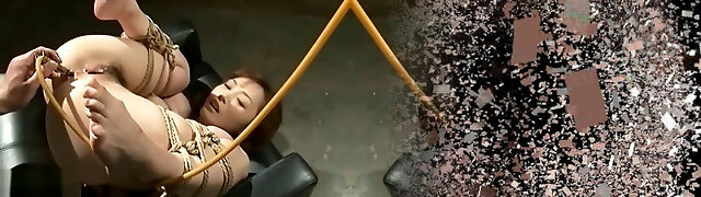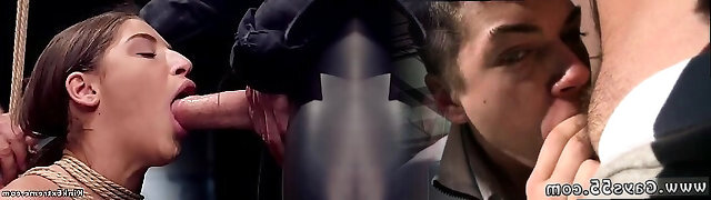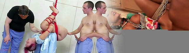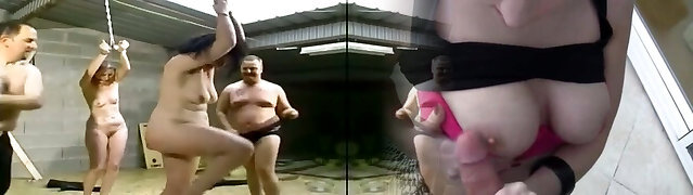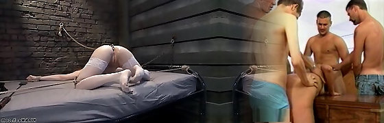2 perverted guys spank and fuck anal hole of tied up and suspended porno model