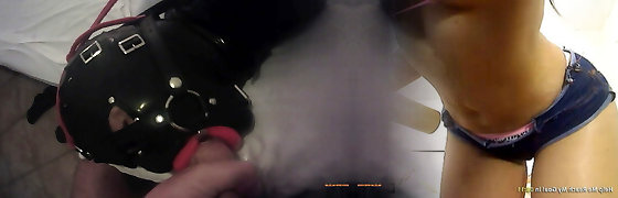 TEASER Laura is frogtied in latex catsuite and high heels, throated with a lip open mouth gag Point Of View