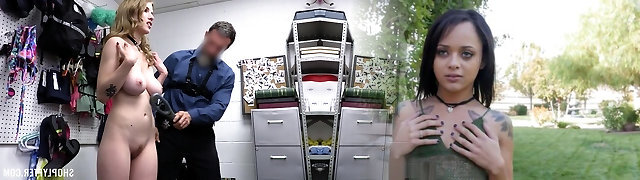 Shoplifter Octavia Crimson is punished by a mall security guard in his office