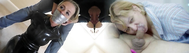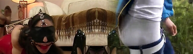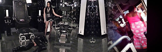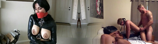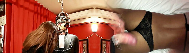 Female Dominance mistress in latex domination playing with slave bondage him to bad