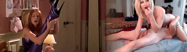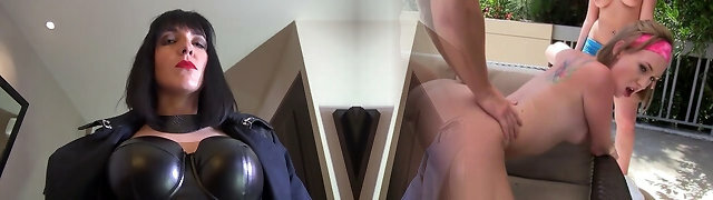 Blonde in Latex Attire Maitresse Madeline Pegging and Spanking a Guy