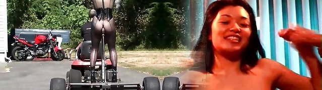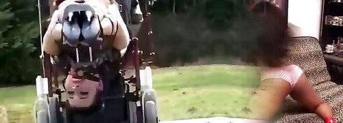 Gagged and confined marionette girl gets driven around while being drilled by a machine