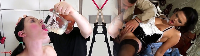 Freak in mask fucks anus of nice girlfriend putting her head in rest room cup