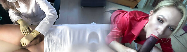 Curvy underwear femdoms wanking off submissive patient in ffm