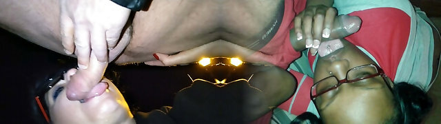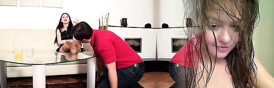 My schoolgirl slurping sitting on my legs in front of my wife