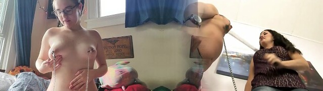 Nipple clampped gagged slut thumbs her vag and plays with her nipples