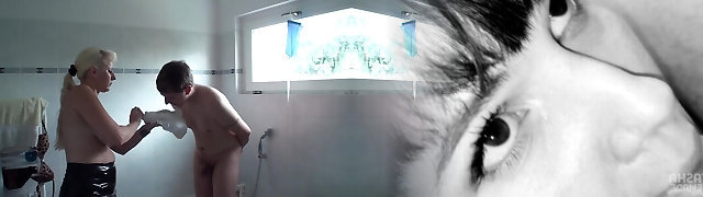 Nasty busty grandma MariaOld pissing, take off pantyhose and insert it in the shaved pussy