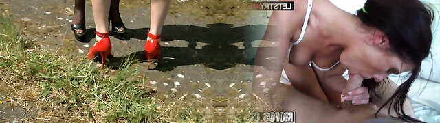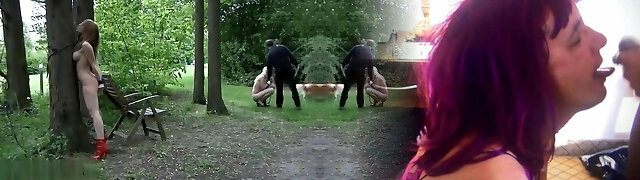 Threesome fucky-fucky slave enjoys cock outdoors