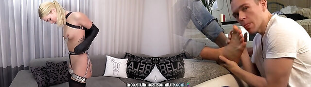 Slave girl manacled mitts up and has to cum crossed legs while standing