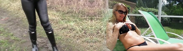 Smoking cigarettes in a leather outfit, wellies and handcuffs