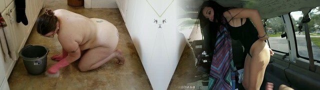 Collared gimp gets plugged before scrubbing the kitchen floor