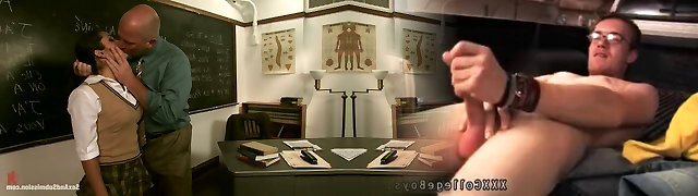 Schoolgirl trussed to stocks fingered by teacher while hatch fucked by schoolguys cums to gullet and face in the office feature