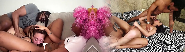 Dark-hued gets eaten out by her girl mate, while getting fucked by a BBC